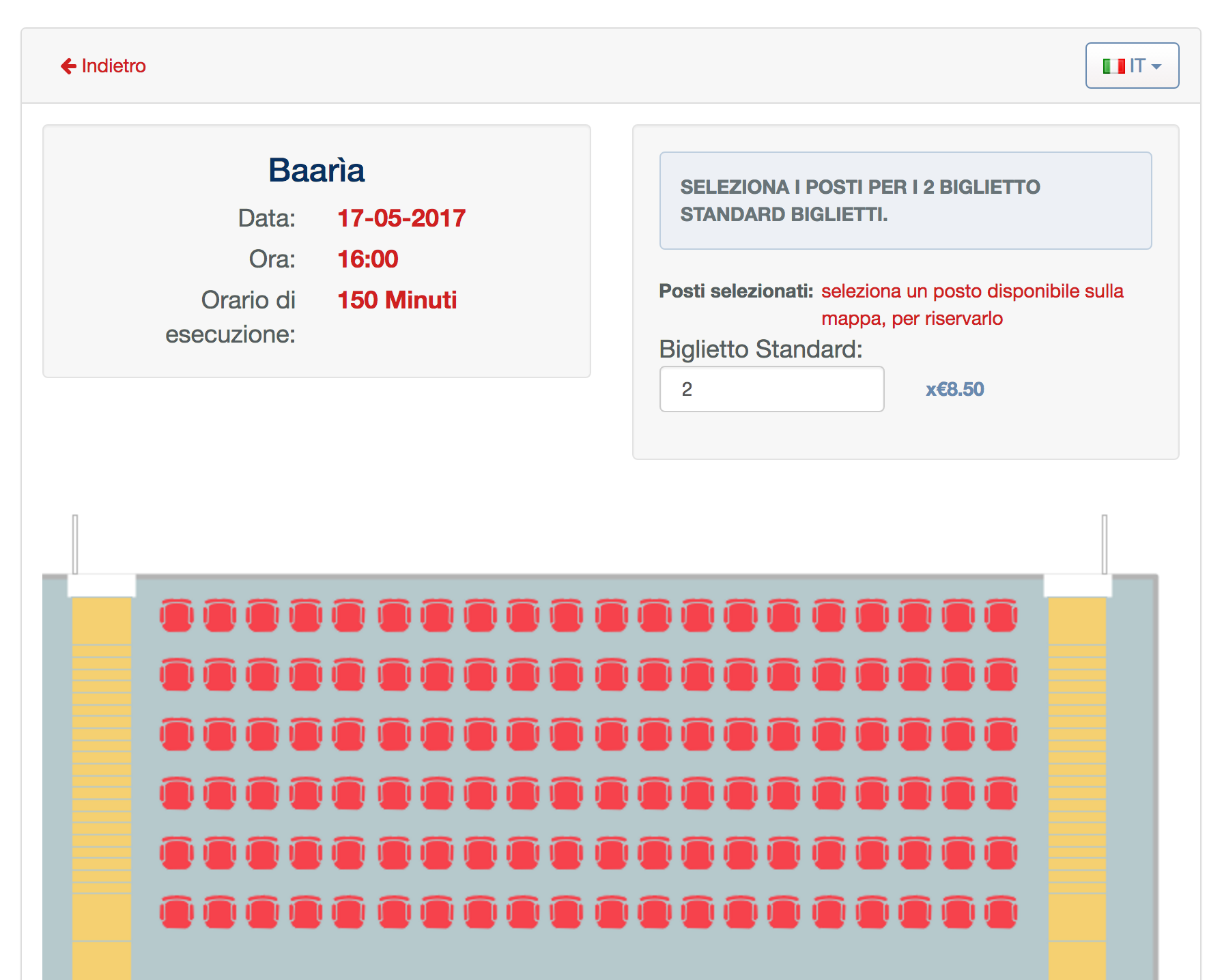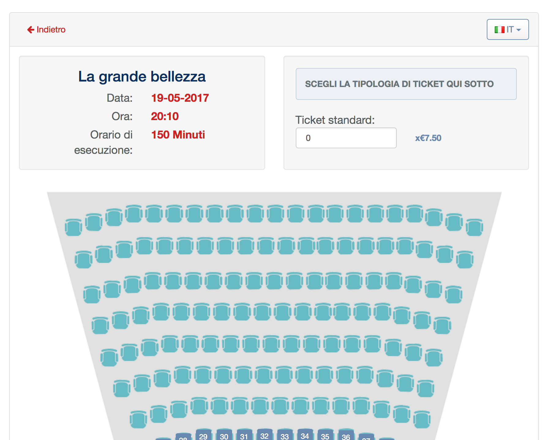 Sistema di prenotazione posti per sale cinematografiche e similari (monosala, multisala). Possibilità di abilitare pagamenti on-line, gestire prenotazioni, personalizzare eventi e spettacoli, ecc… Questo potente sistema di prenotazione può essere integrato ad un qualsiasi sito web proprietario.